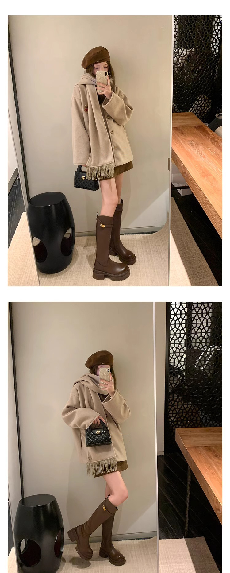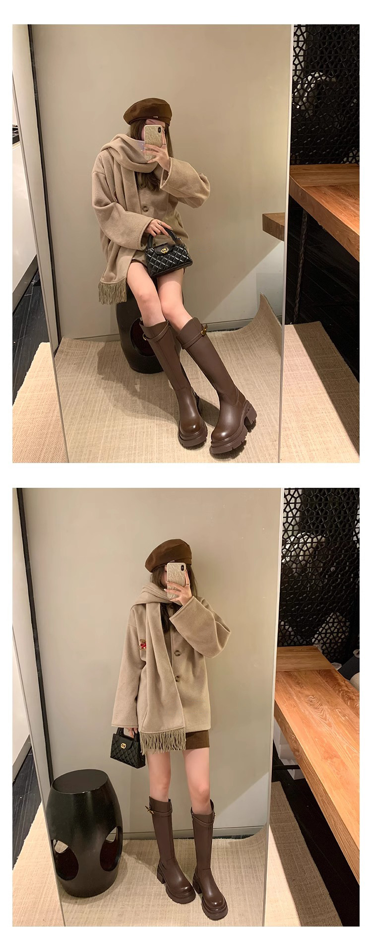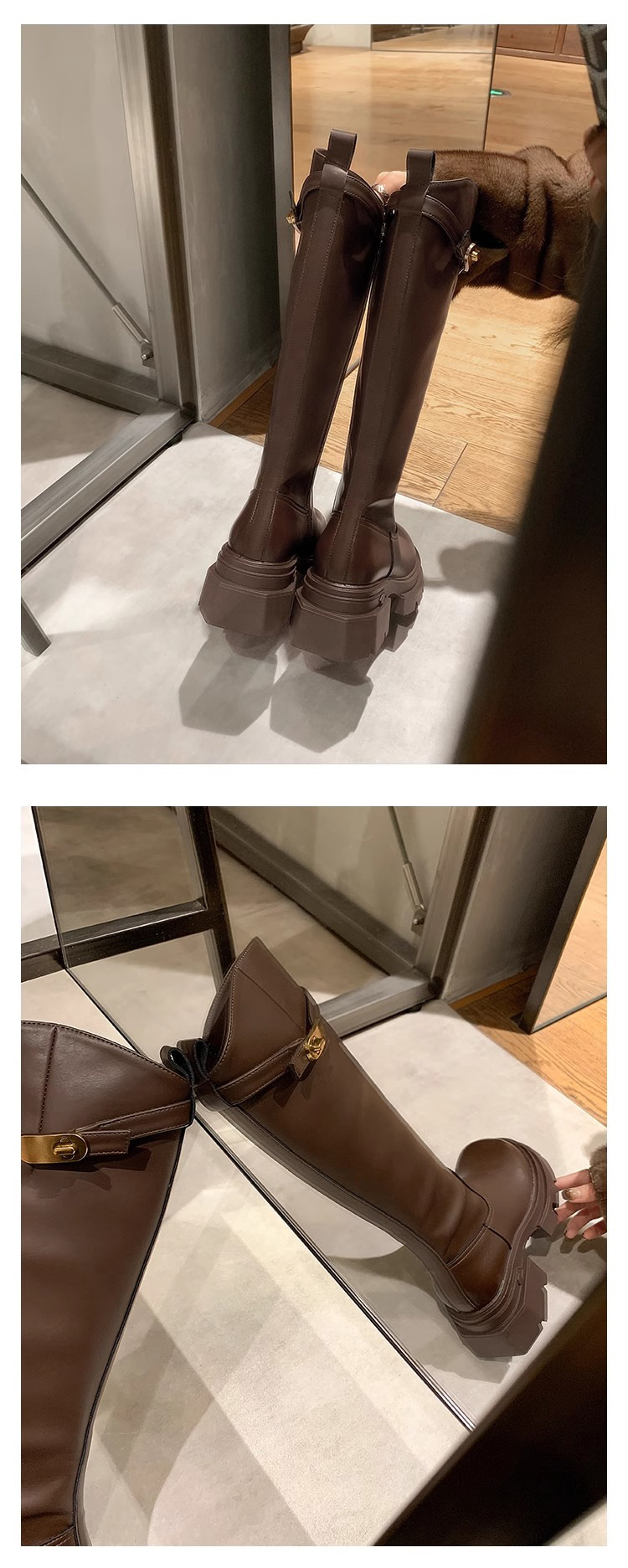 Slimming Boots Mid-Calf Long Boots for Women Autumn Winter Small Gold Buckle Slanted Thick Sole Height Increasing Riding Boots